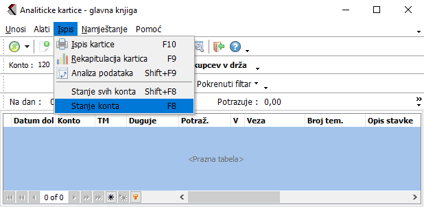 Vrlo zanimljiva funkcija ako želite brzo pogledati stanje analitičke kartice koju trenutno pregledate. Izaberite tu funkciju i izaberite datum, za koji vas zanima stanje. Na ekranu će te dobiti stanje te kartice.