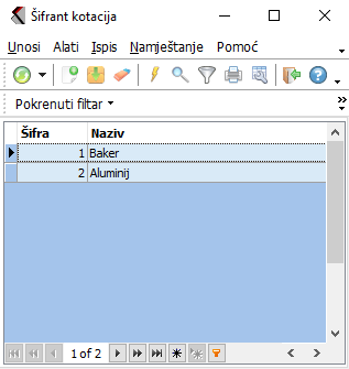 U šifrantu unosite sve vrste kotacija, koje trebate pri svom radu. Izaberite tu opciju i na zaslonu će te dobiti prikaz šifranta, o radu s prikazima (tabelama) možete pročitati u uvodu. U glavnom meniju imate na raspolaganju sve funkcije, koje tu možete upotrijebiti: