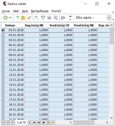 Modul je namijenjen unosu i pregledu deviznih tečajeva jedne valute. Izaberite tu opciju i na zaslonu će te dobiti prikaz, o radu s prikazima (prozorima) možete pročitati u uvodu. U glavnom meniju imate na raspolaganju sve funkcije, koje tu možete lahko upotrijebiti: